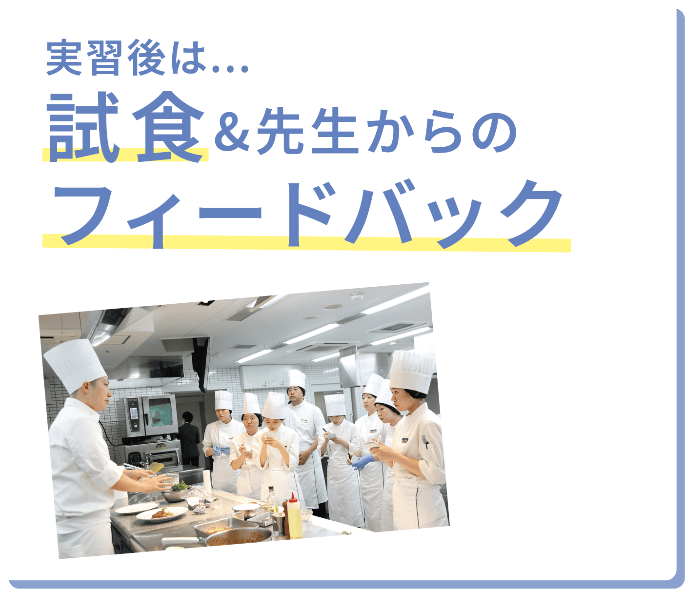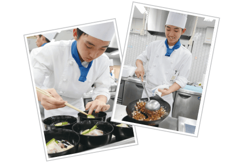 ⽇本・⻄洋・中国料理の調理実習を繰り返し⾏うことで基礎⼒を習得。