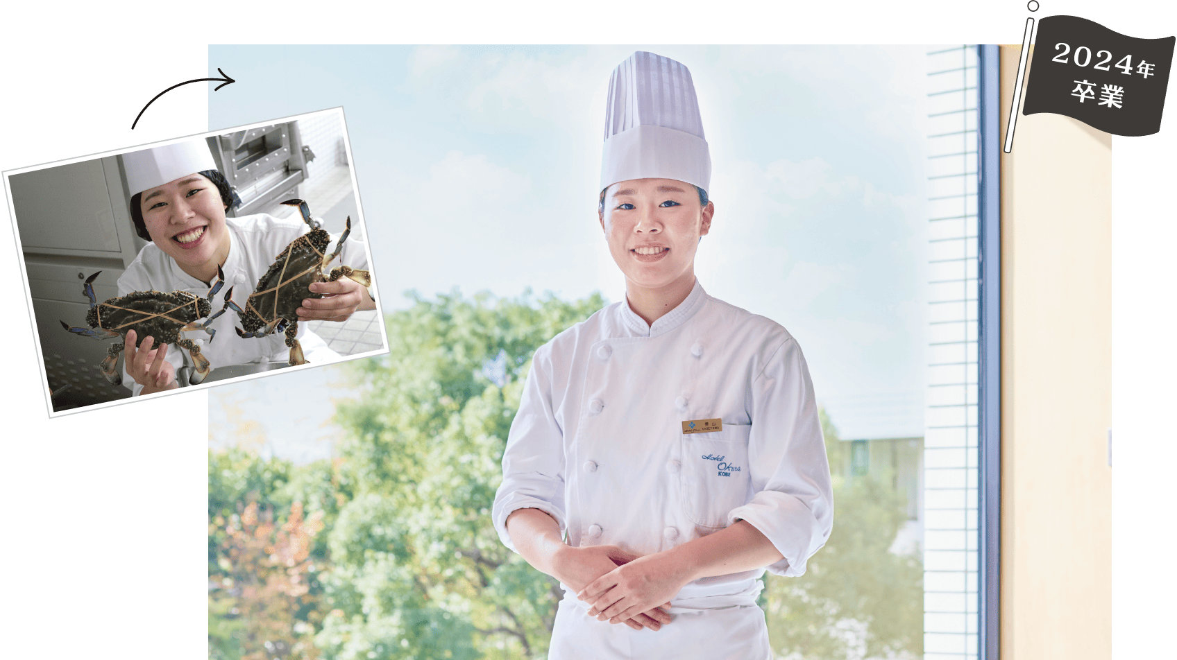 好きな授業は西洋料理。実習が楽しくてフレンチの道に進みたいと思うようになりました。自分の店を持つという目標の実現に向けて、現場でもっと腕を磨きたい。一日も早く一人前になれるよう頑張ります。