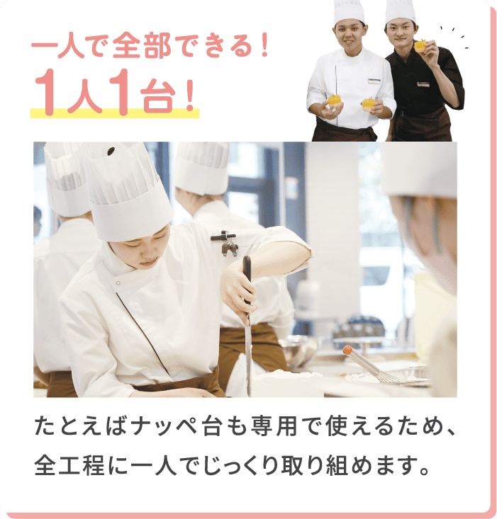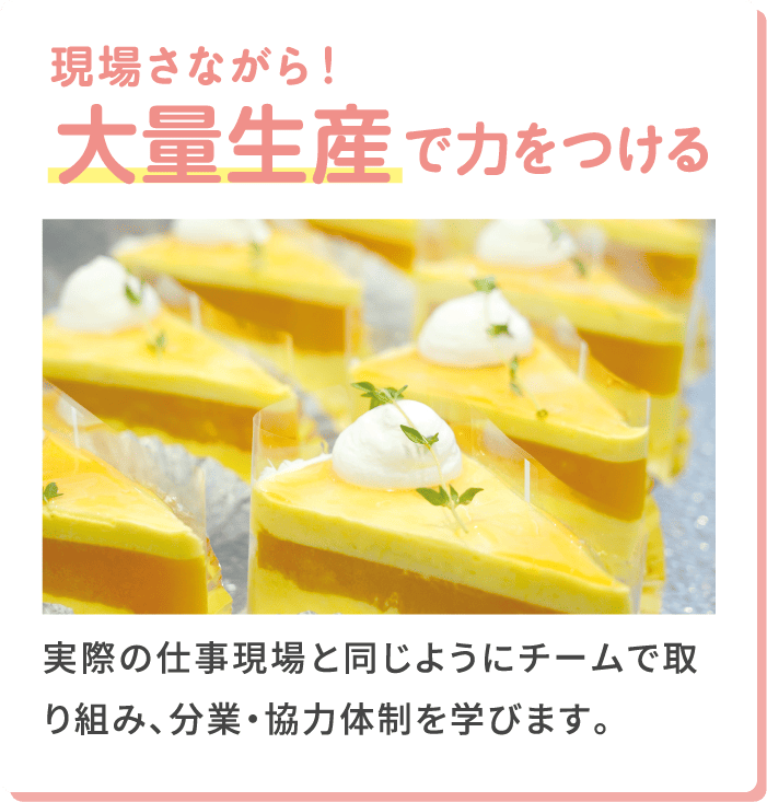 洋菓⼦、和菓⼦、製パンの技術を1年間の短期集中で学ぶことができます。