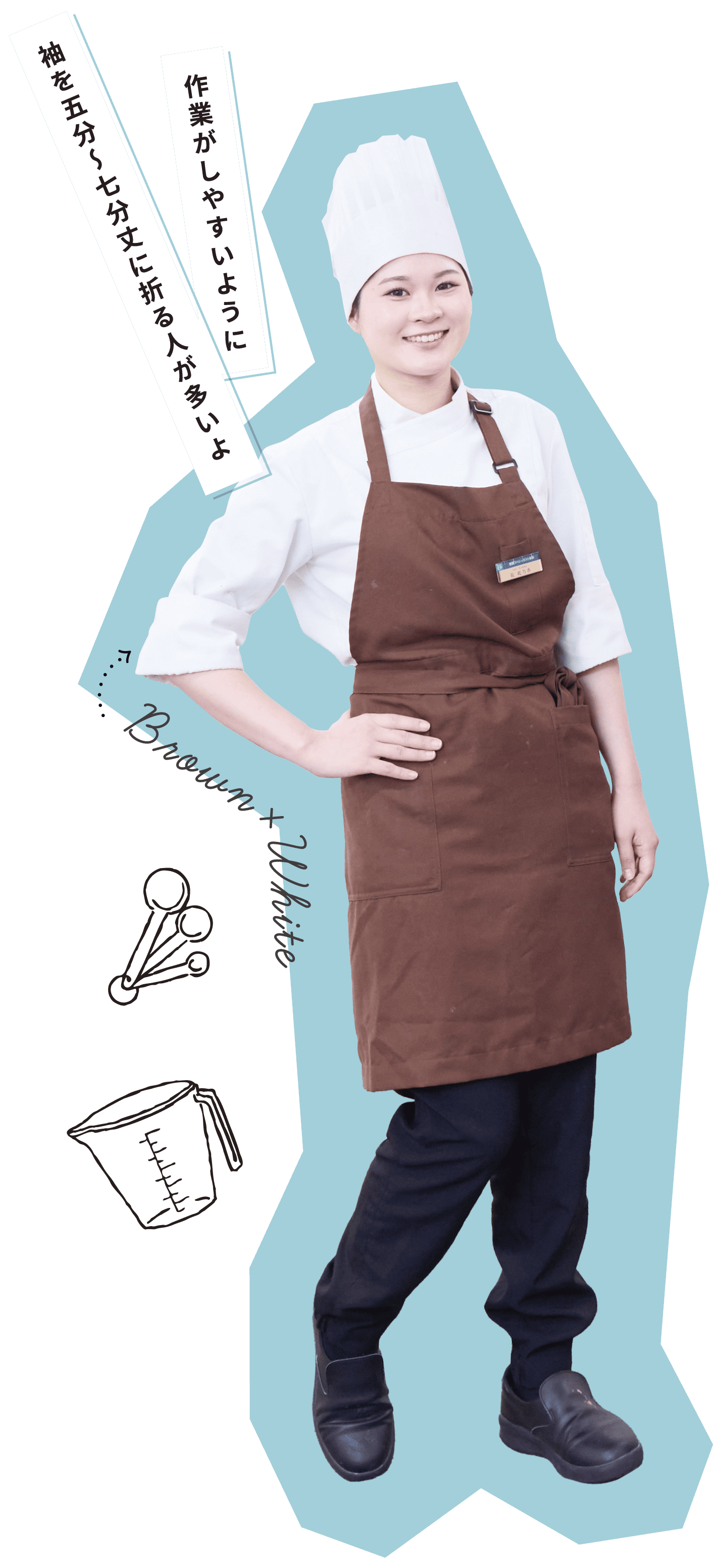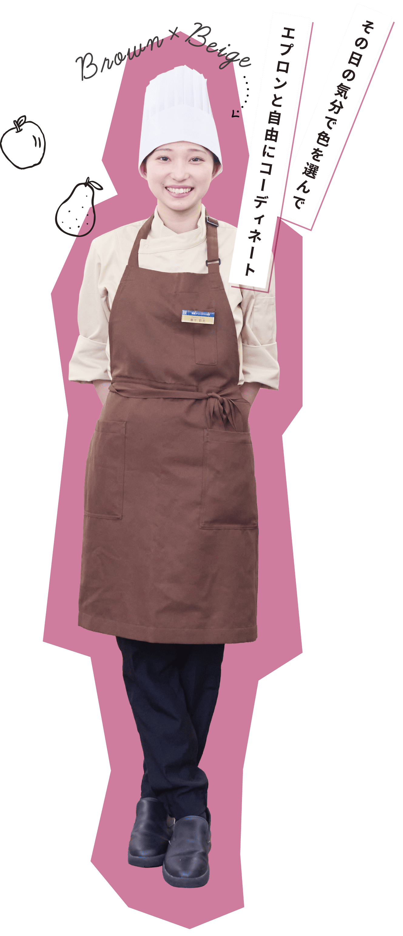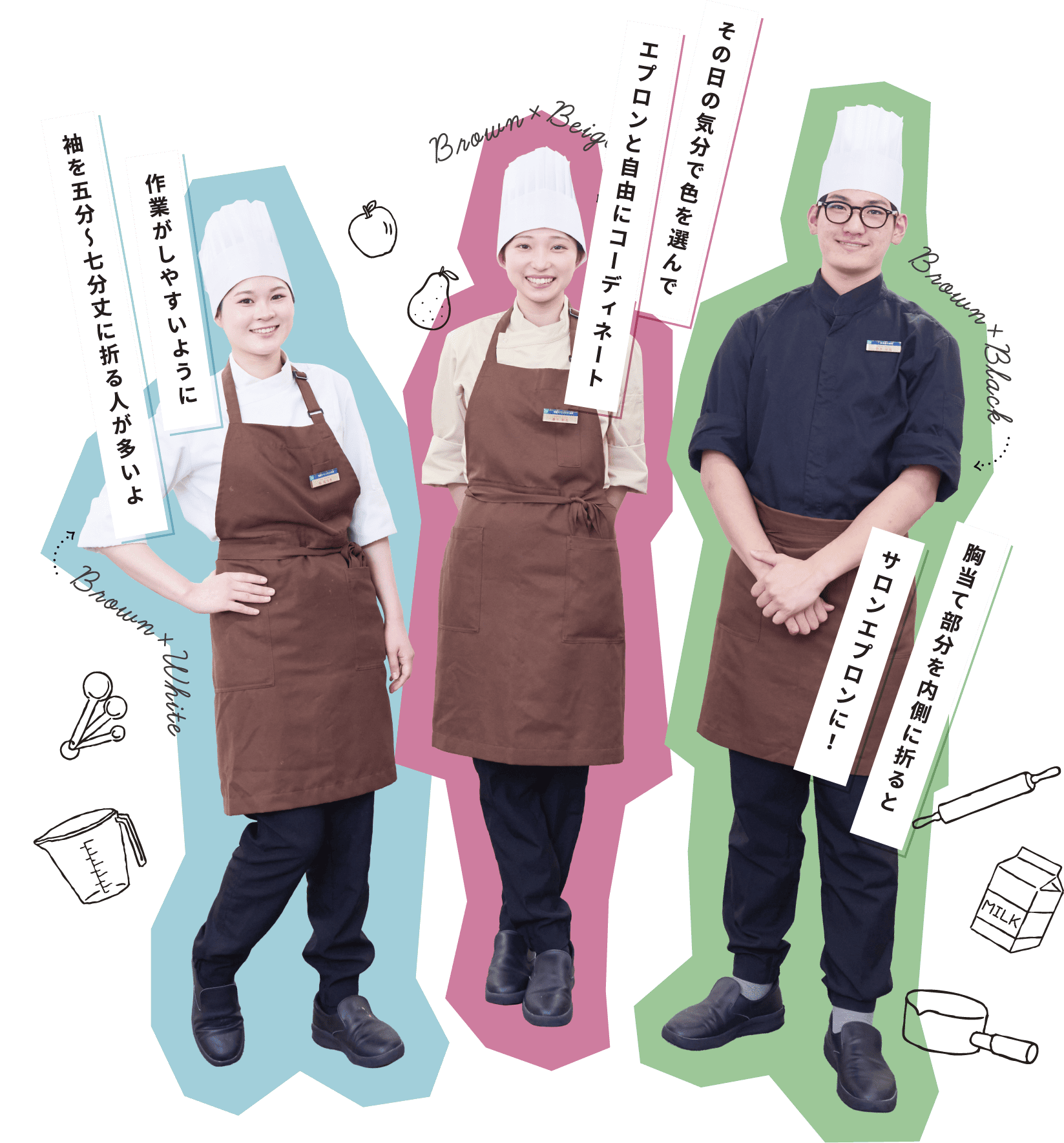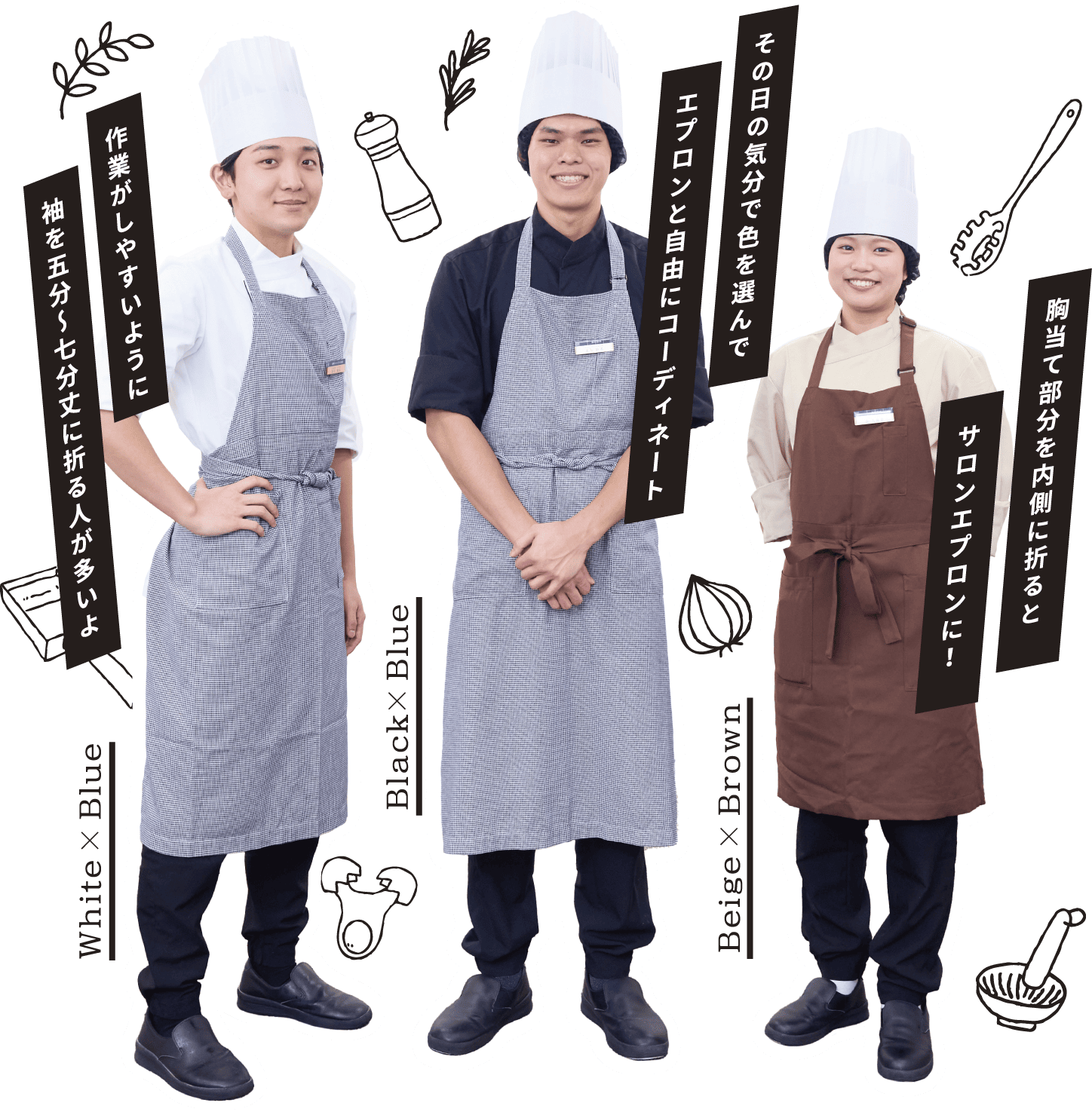コックコートは、ベージュ、ホワイト、ブラックの3⾊展開。